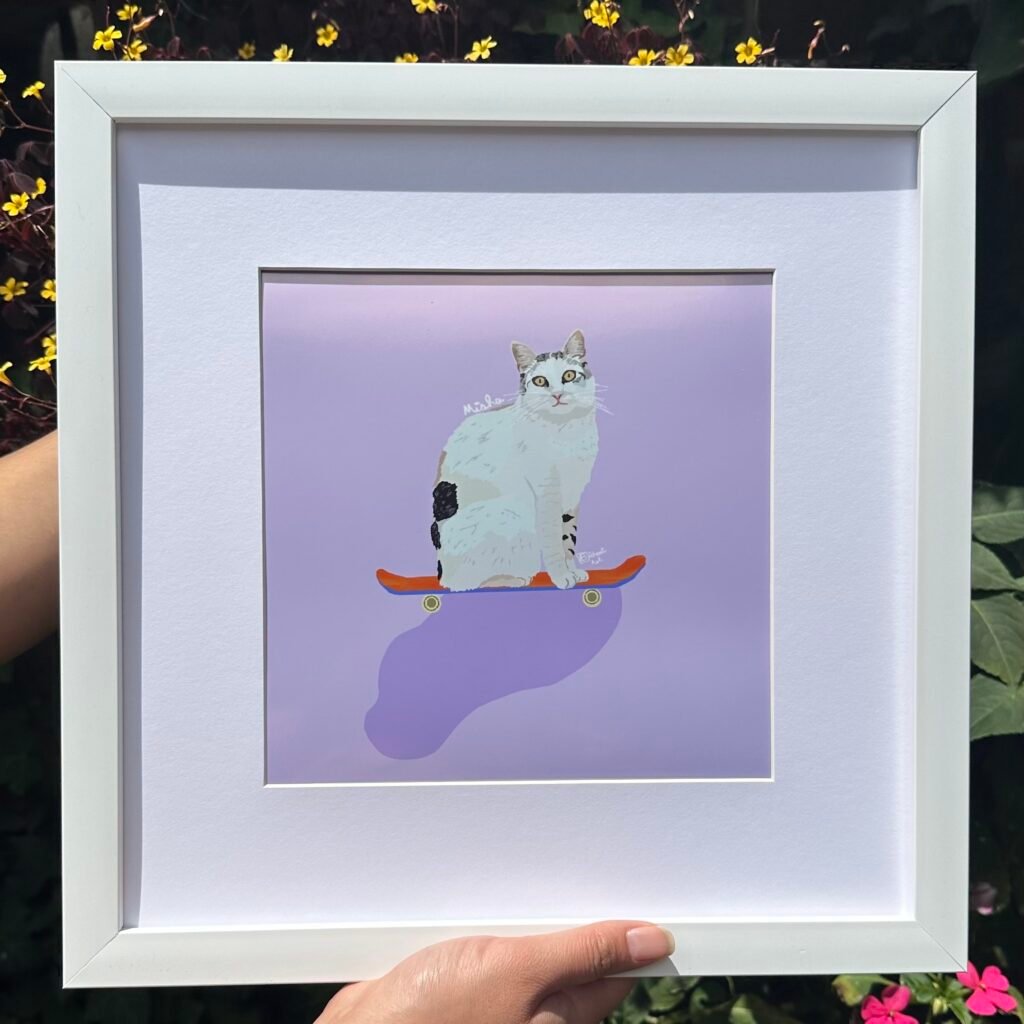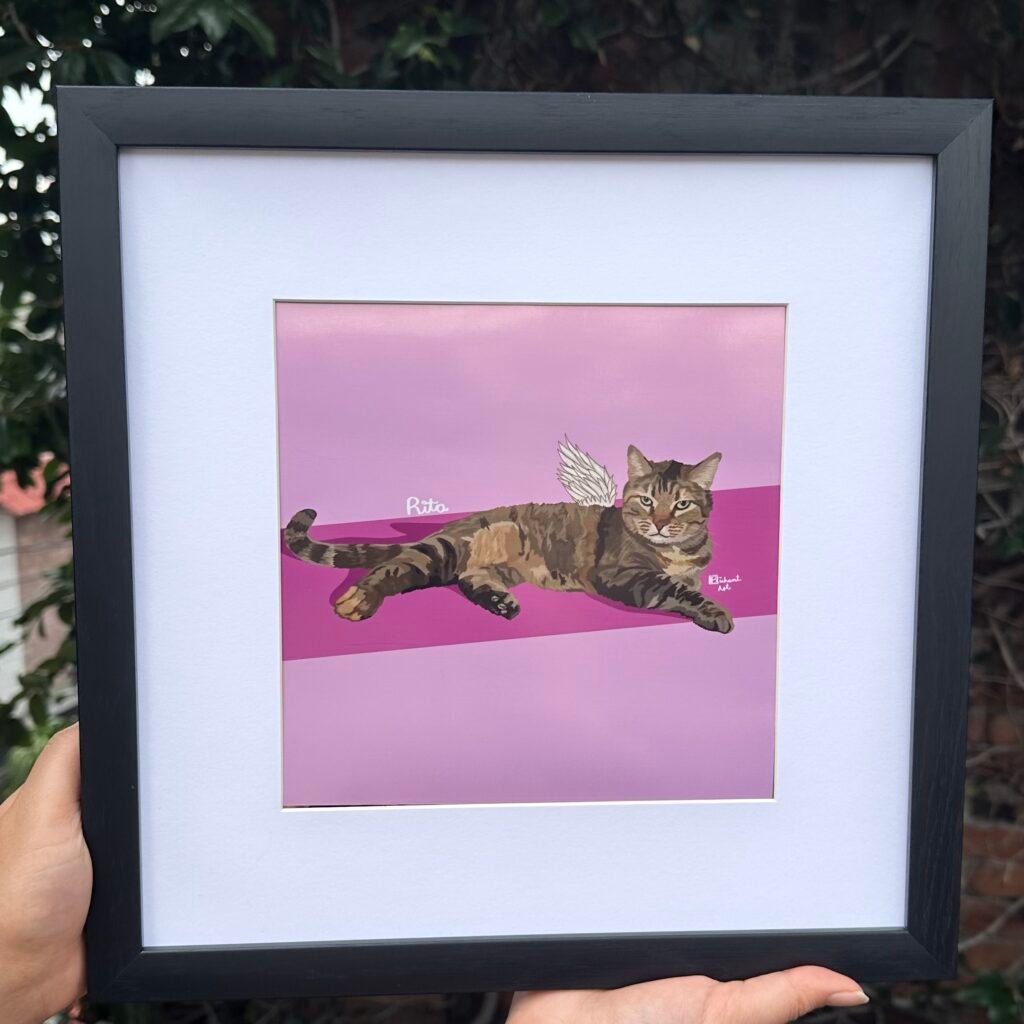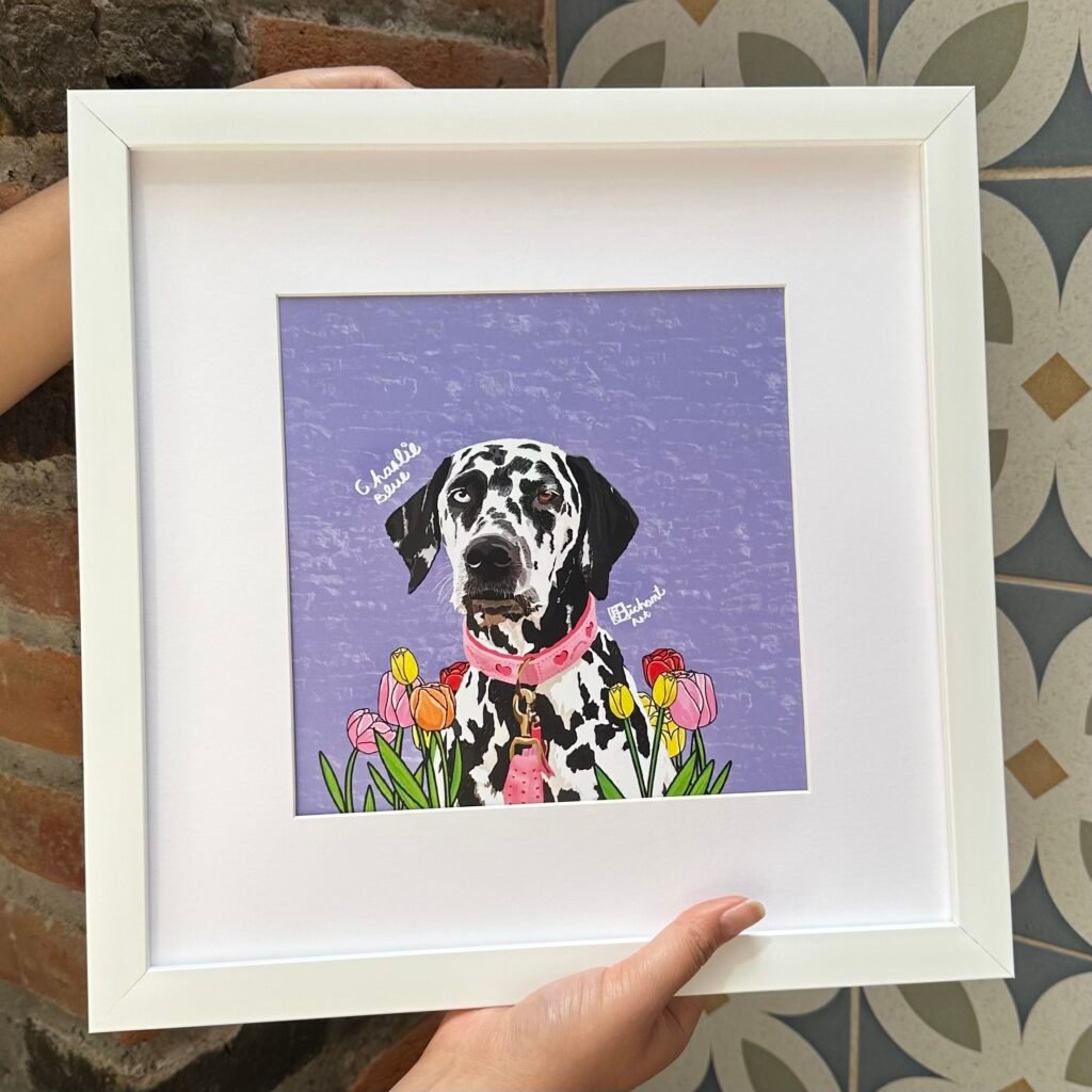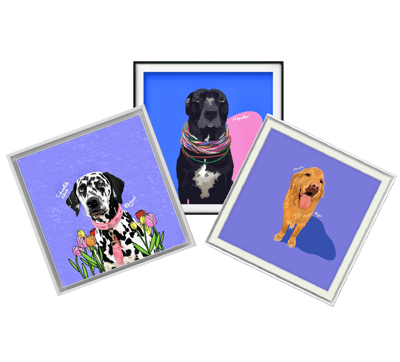 Realizamos retratos digitales personalizados de mascotas en estilo artístico. Puedes elegir entre formato digital o impreso, con o sin marco.